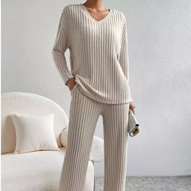 跨境爆款2025秋季欧美时尚休闲直筒裤气质宽松V领坑条针织两件套