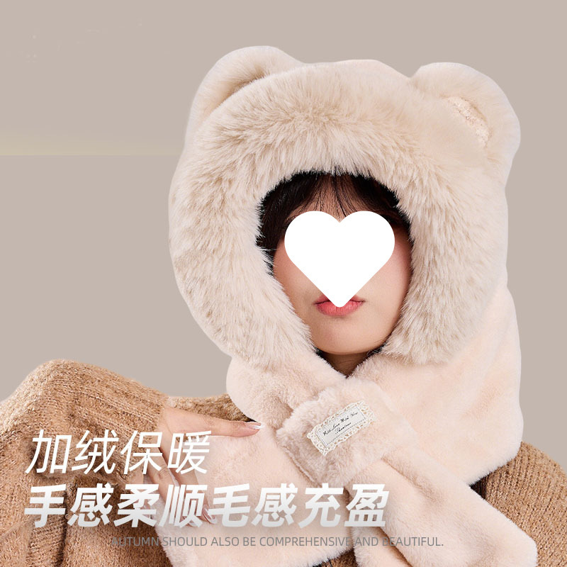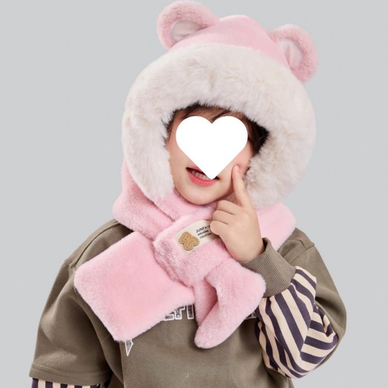 -               卡通小熊保暖滑雪帽子围巾围脖一体女冬季护耳罩雷锋抖音爆款批发