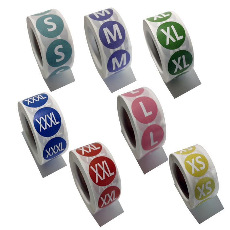 现货圆形彩色白字不干胶尺码贴XXS至XXXL尺码粒服装字母贴纸标签