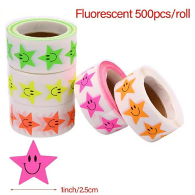 跨境现货1英寸荧光彩色亮色彩虹五角星笑脸微笑diy不干胶标签贴纸