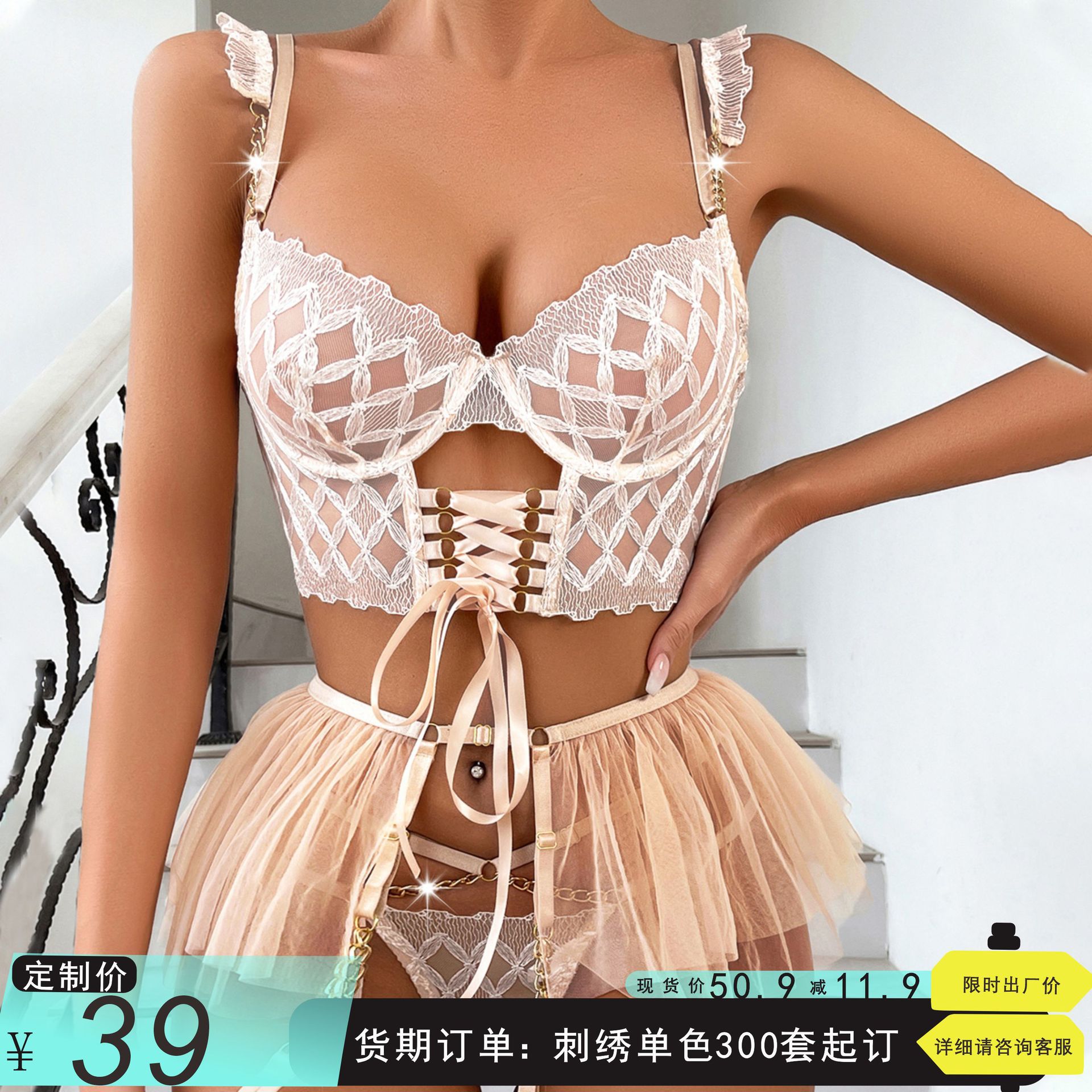 2024速卖通热卖新款时尚菱格刺绣性感绑带网纱蓬蓬裙情趣内衣套装