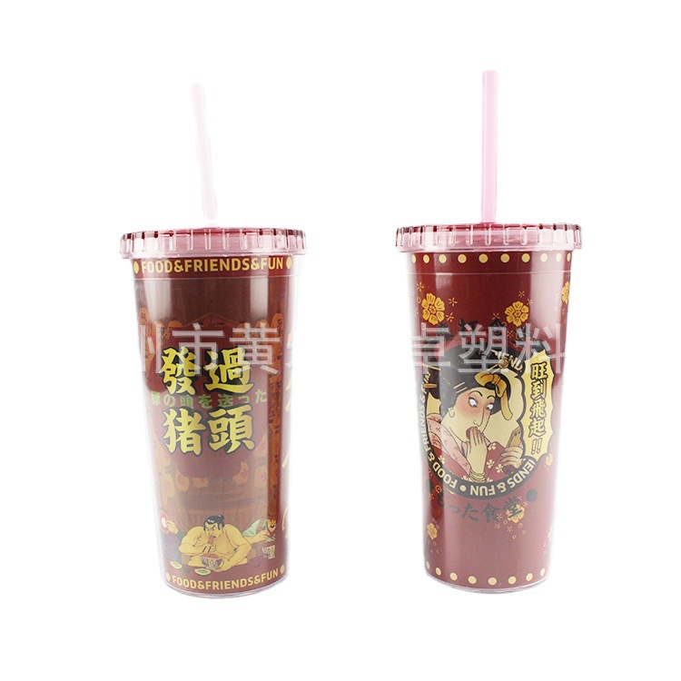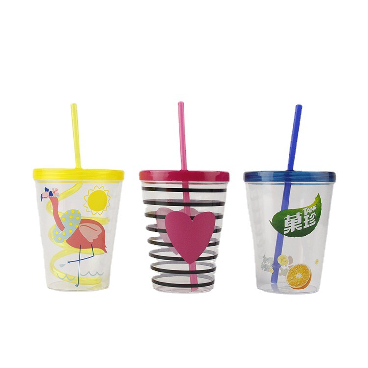 16oz直筒双层塑料杯饮料吸管杯子透明带盖韩国杯子LOGO卡通吸管杯