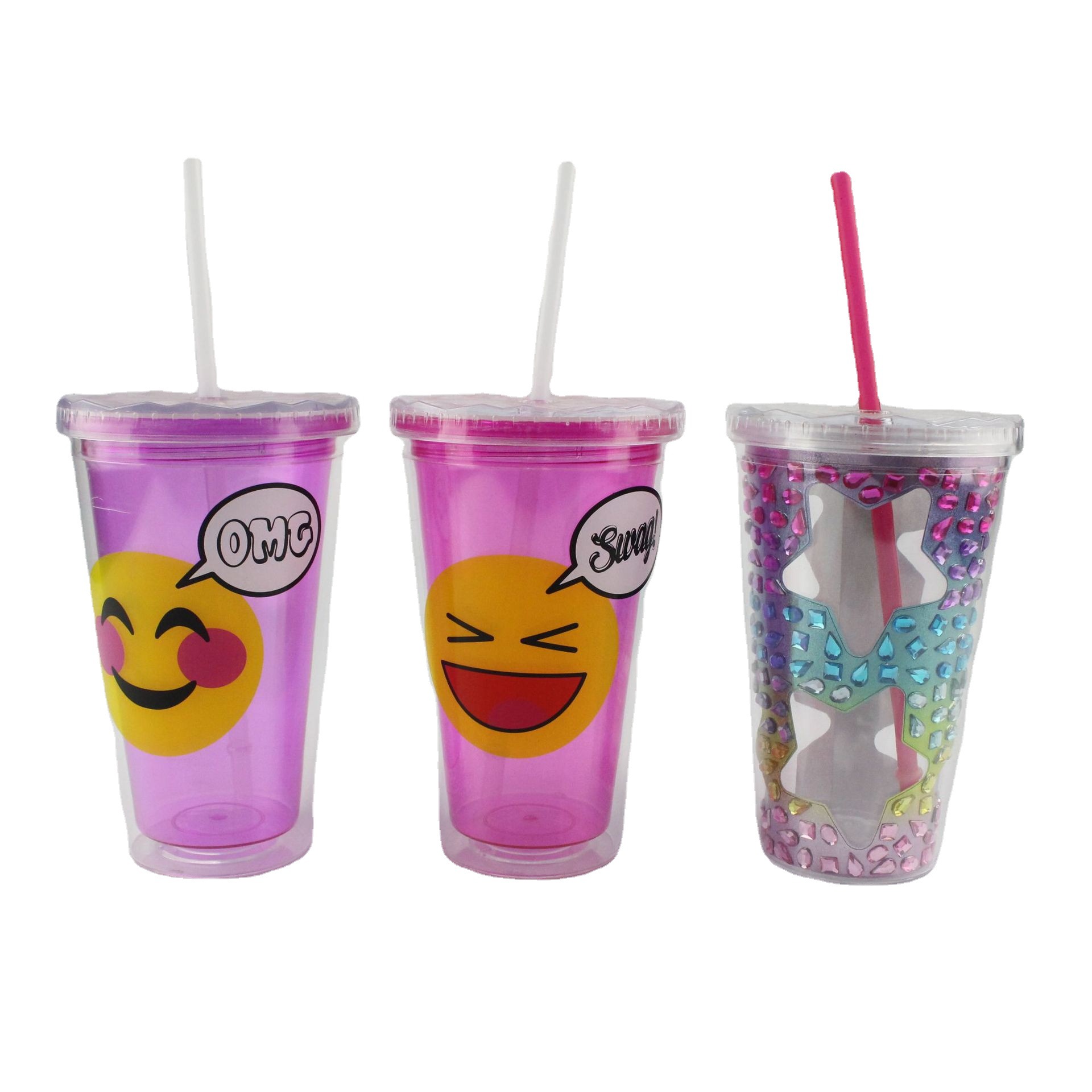 ins风可爱笑脸450ml直筒双层吸管杯塑料水杯创意礼品杯奶茶杯