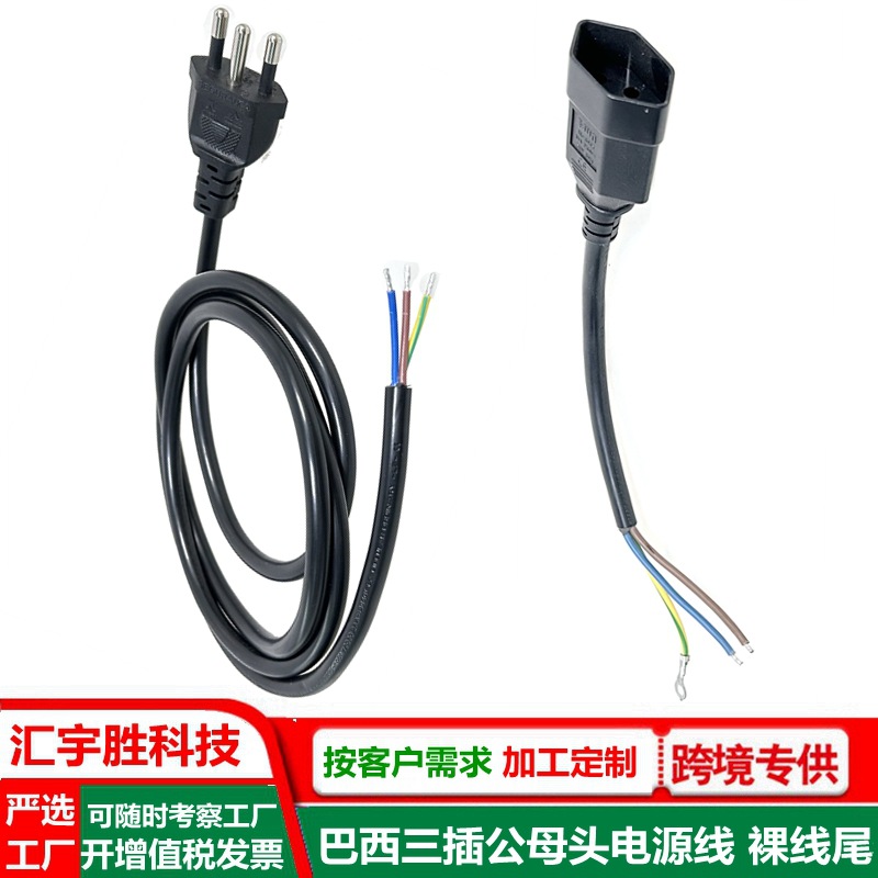 巴西三插母头线 巴西规3孔母头电源线 裸尾 巴西标叁芯插头延长线
