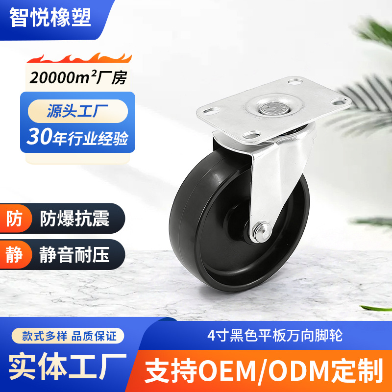 4寸黑色平板万向脚轮 静音置物架推车轮 平板定向脚轮
