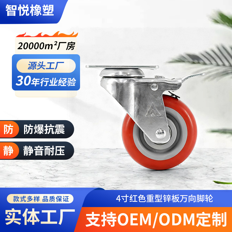 4寸/5寸红色平板万向脚轮 静音置物架推车轮 平板定向脚轮