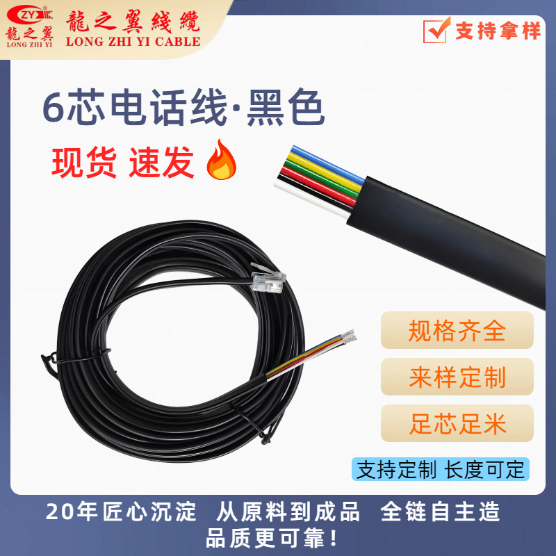 现货6芯电话线黑色扁平通信线适配RJ11/12电话线通用可加工水晶头
