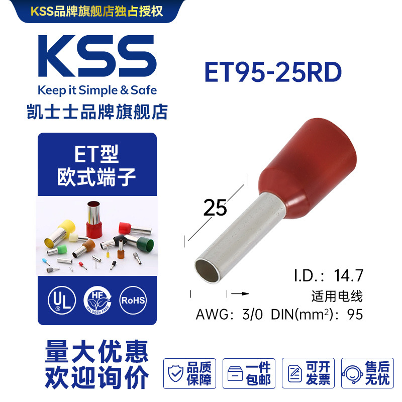台湾KSS凯士士欧式端子ET50-20BE100个管型预绝缘端子铜鼻子
